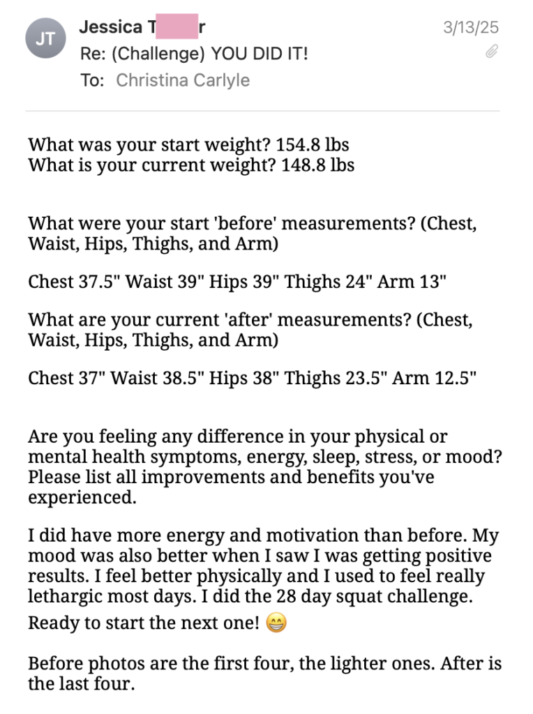 If you try my workouts, recipes, or tips, or have results to share I want to know about it! Tag me @christina_carlyle in your posts & story so I can connect with you